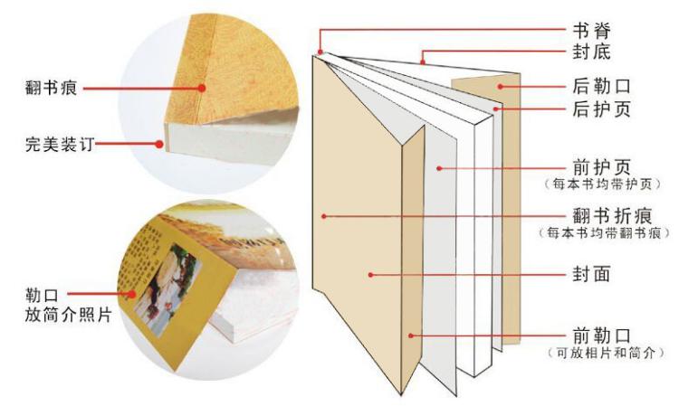 书脊(又称封脊):书脊是指联接封面和封底的书脊部。书脊上一般印有书名、册次(卷、集、册)、作者、译者姓名和出版社名,以便于查找。