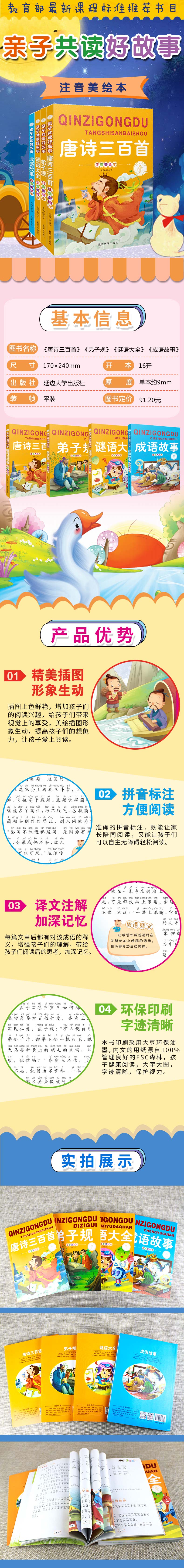 《唐诗三百首》唐代诗人群星灿烂,除世界闻名的李白、杜甫、白居易之外,今天知名的还有二千三百多人。他们的作品可称得上是国家的瑰宝。因此,为使唐诗文化流传下来,我们结合了现代儿童的阅读习惯,精心选编了这本《唐诗三百首》。其中精选了许多脍炙人口的经典唐诗,篇幅短小精悍,内容浅显易懂。每首唐诗还配有注释、译文,方便孩子诵读与理解。此外,每首诗还配有精美的彩色插图,让阅读充满诗情画意。