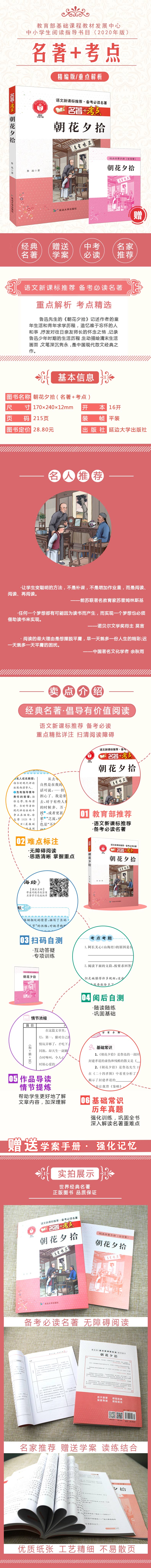 鲁迅先生的《朝花夕拾》记述作者的童年生活和青年求学历程,追忆难于忘怀的人和事,抒发对往日亲友师长的怀念之情,记录鲁迅少年时期的生活历程,生动描绘清末生活画面,文笔深沉隽永,是中国现代散文经典之作。在生命的长河里,露曦与朝暮更替交织,在看不清前进方向的时候,拾起脚下路边的野花,装进思想的背篓。