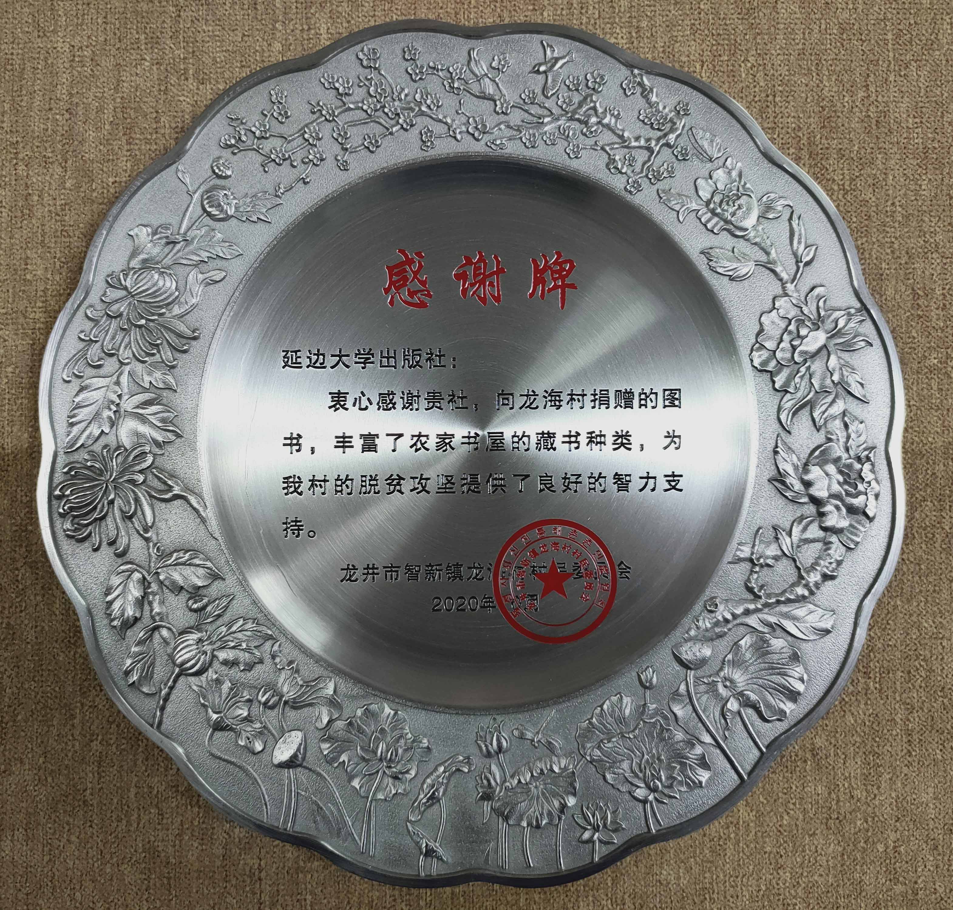10月15日,我社向延边朝鲜族自治州龙井市智新镇龙海村农家书屋捐赠了2000余册图书,价值4万多元。近日,龙海村村民委员会向延边大学发来感谢信,信中对延边大学及我社表示感谢,并向我社赠予感谢牌。
